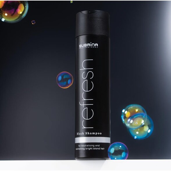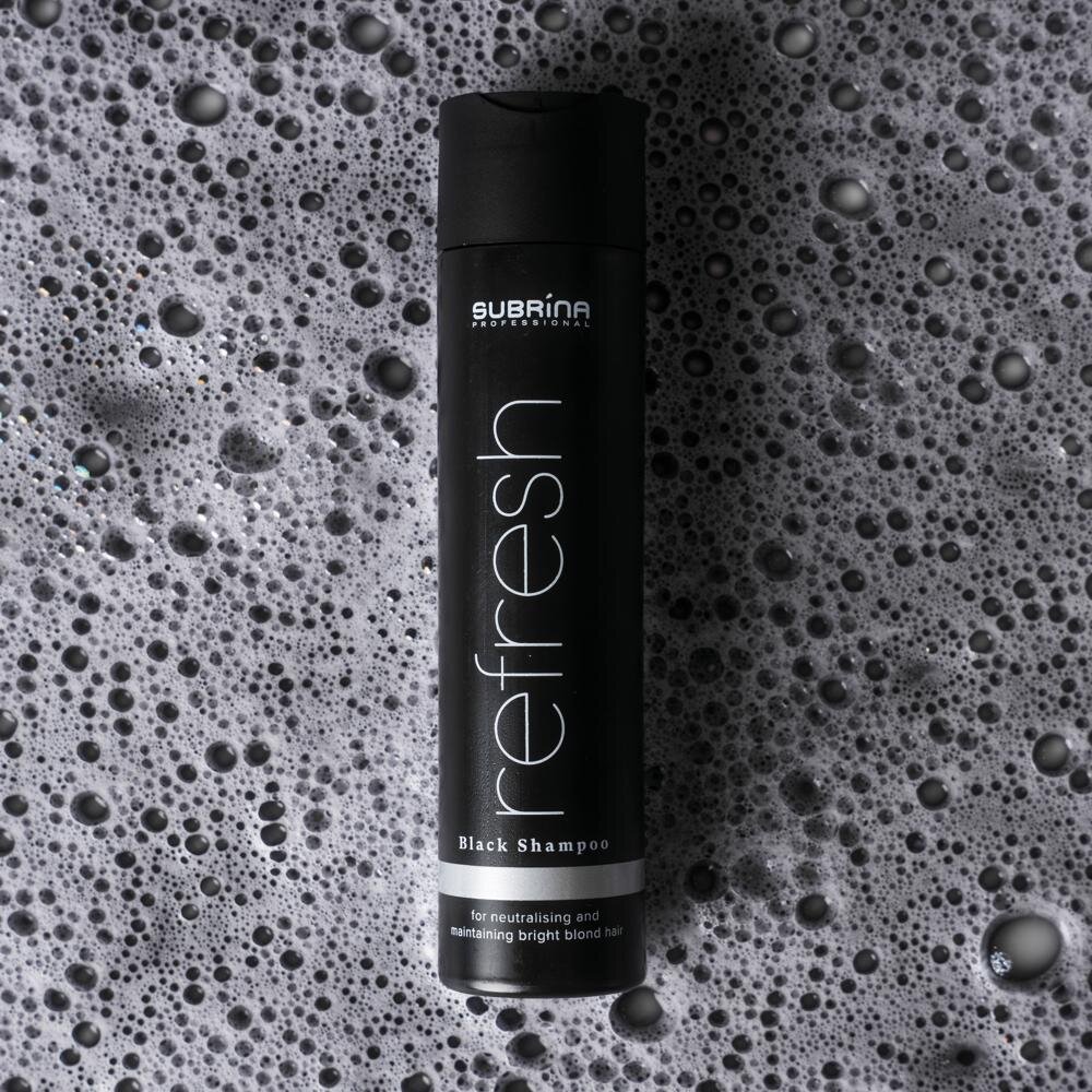Profesionálny čierny šampón na blond vlasy, ktorý neutralizuje žlté tóny a prináša čistý chladný odtieň - Subrina Professional Refresh Black čierny šampón na vlasy