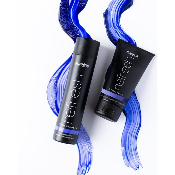 Pre ešte výraznejší a dlhodobejší výsledok odporúčame kombinovať fialový šampón na vlasy s Violet maskou z radu Subrina Professional Refresh Violet, ktorá prehlbuje tónovací efekt a zároveň poskytuje intenzívnu výživu vlasom. Táto kombinácia je ideálna najmä pre blond, melírované alebo sivé vlasy, ktoré potrebujú nielen neutralizáciu, ale aj regeneráciu.